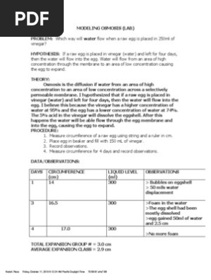 This can serve as the cooking show method of preparing the eggs prior to the lab in order to observe potential size differences on the day of the lab. Right now, as you read this, there are millions of osmosis is the scientific term that describes how water flows to different places depending on certain conditions. View egg osmosis lab.pdf from bio 18 at john overton comprehensive high school. Today you will have visual evidence (what you see) and numerical evidence (the egg's mass) to prove that osmosis has occurred. Download & view egg osmosis lab report as pdf for free.